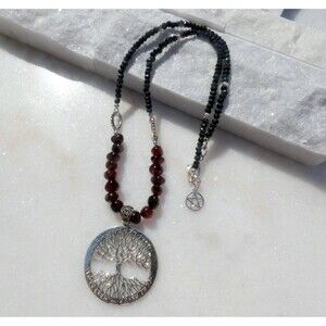 Unique and protective pendant necklace. Made with a sterling silver pendant designed by Mickie Mueller inscribed in the Theban Alphabet. "As above so below, as without so within" Beautifully detailed tree and ornate bail. Black spinel beads with accents of Karen Hill Tribe fine silver beads. A sterling pentagram charm hangs from the clasp. Measures 20 inches. One of a Kind. Handmade.