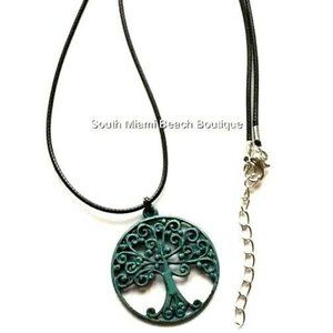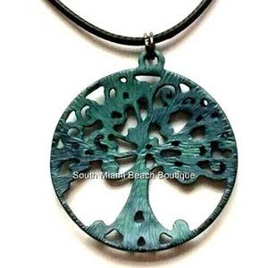 Tree of Life Necklace Celtic Green Patina Brass Pendant Black Cord Chain