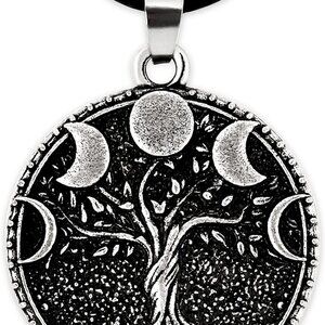 The tree of life with moon cycle necklace symbolizes the interconnectedness of all life and the cyclical nature of the universe