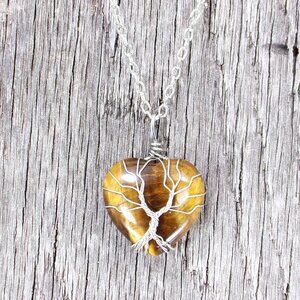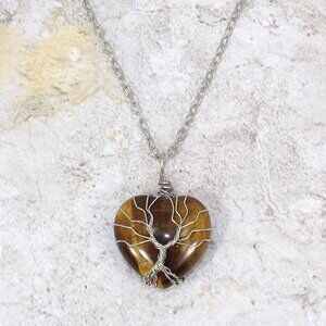 Brown tiger eye stone heart pendant necklace with a tree of life design on it. The heart stone is hand wire wrapped with the tree of life design on it. A beautiful and timeless pendant necklace for everyday or any special occasion. New and never worn.