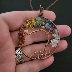 Tree of life wire wrap rainbow chakra stone bronze tone crystal pendant necklace