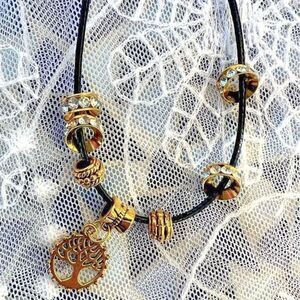 The Tree of Life pendant is the center piece with 6 additional sliding charms in detailed gold tone and sparkly rhinestone rondels.