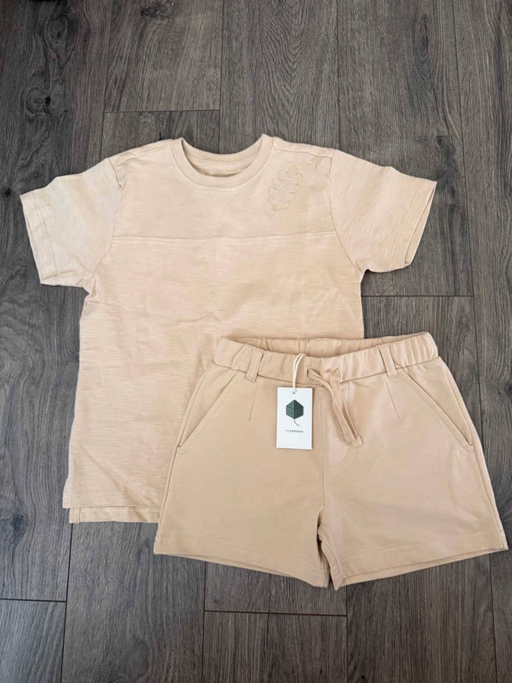 Cozy matching tee and shorts in a soft beige tone. Crew neck tee with subtle embroidered detail. Elastic waist shorts with drawstring and pockets. Lightweight and casual.