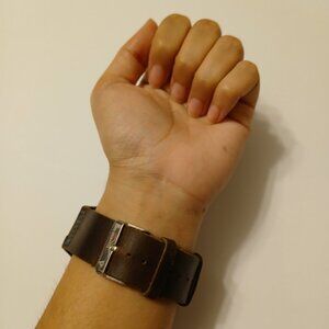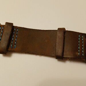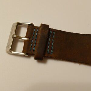 Needs a new battery. The wrist size is 7-8 3/4 inches. The crystal has cracks and needs replacing. There are some scratches on the watch case. There is an engraving on the caseback. The strap has a unique blue stitching accent. It's a casual preppy style. Please view the photos. Thank you!
