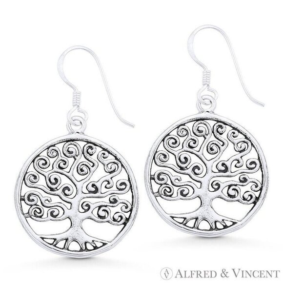 Tree-of-Life Religious Dangling Hook Earrings in Oxidized .925 Sterling Silver