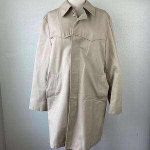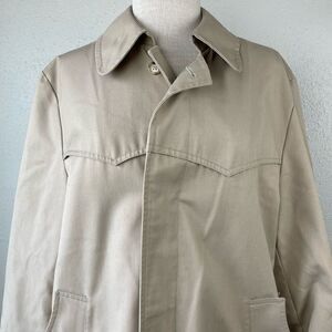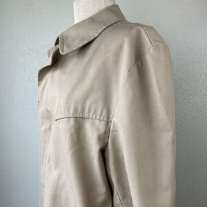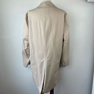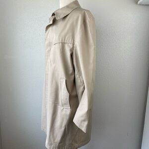 Classic trench style jacket in excellent preowned condition. This jacket originally had a lining but it is missing. It measures 22 inches armpit to armpit laying flat and 34 inches in length from shoulder to hem.