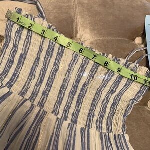 This is a new with tags blue and white striped sundress with a double ruffle hem and gold Lurex threads throughout that give it a little bit of a sparkle. This has an elasticized top and has shoulder ties. This is a sizing sample for this company and it is marked as small but I’m gonna call it an XS. You can see how it fits my extra small mannequin and also by the measurements I would say that this is more of an XS. May also be used as a top if you feel it’s too short.