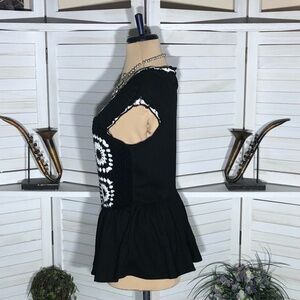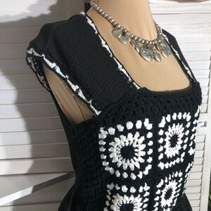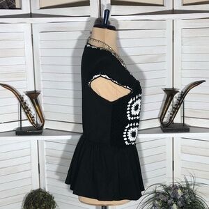 This Trendmates peplum top delivers a playful boho style with a bold black and white crochet design across the bodice. The flattering peplum hem and stretch fabric create a comfortable and stylish silhouette, ideal for casual chic looks.