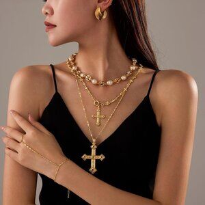 Features: Elegant layered gold-tone plated cross pendant decorated with glittering cubic zirconia stones. Comes with adjustable chains for a custom fit. Great for elevating casual outfits or adding a chic detail to formal wear.