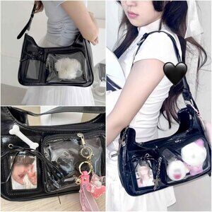 Features: This eye-catching crossbody is made from a sleek fanx leather with a patent finish, featuring transparent display panels that are perfect for highlighting pins, charms, or collectibles. Its Y2K-inspired aesthetic blends kawaii and coquette vibes, making it a fun, fashionable accessory for festivals, parties, or everyday outings. Adjustable strap measures around 39 inches, so you can customize the fit for comfort.