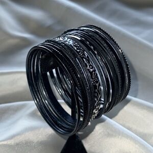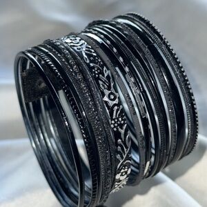 This stunning bangle set features a mixed textures and hues of black, gray and silver tones, perfect for adding a touch of elegance to any outfit. Mix with other colors like gold or silver. Ideal for both casual and formal occasions. Lightweight. Approximate 3” in diameter. Great condition.