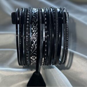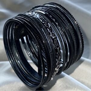 Trendy Black Dark Gray Bangle Stack Set Silver Accents 18 Pieces