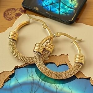 gold mesh hoop earrings | trendy textured hoops | 18k gold stainless steel jewelry | modern gold earrings | chunky gold hoops | lightweight statement hoops | gold hoops for everyday | poshmark trending earrings | chic gold fashion accessories | gold mesh texture hoops | tarnish free jewelry | hypoallergenic earrings | posh gift ideas | bold hoop earrings | stylish gold hoops for women | summer accessories