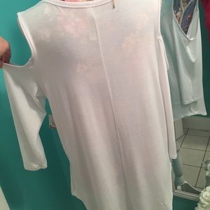 💋BNWT!!! Super comfy, stylish & versatile white, cold-shoulder, v-neck top!!! 💋Lightweight & flowy w/ figure-flattering rounded hem, 3/4 length sleeves & incredibly soft & VERY stretchy rayon/spandex blend material! 💋Bust: 21", Length: 29"-30" (laying flat, one side). ***Necklace not included.***