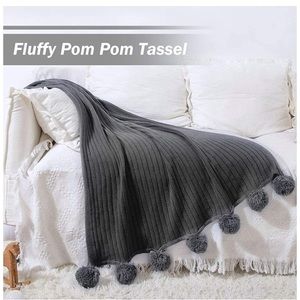 Trendy Dark Grey Pompom Fringe Chic Cozy Soft Throw Blanket/Cover Dorm/Bedroom