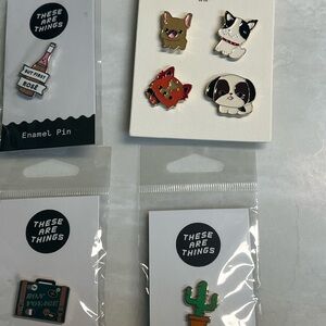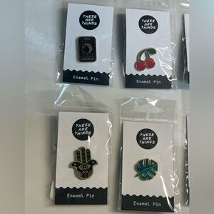 Stylish enamel pins featuring unique designs like cherries and a hamsa hand. Perfect for adding flair to bags or jackets.