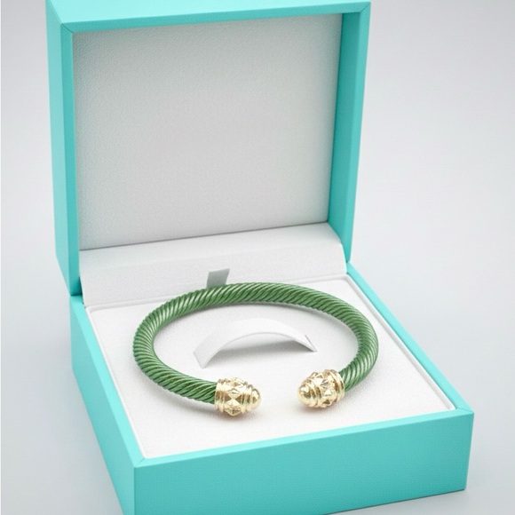 This elegant bracelet features a stunning green band with exquisite gold accents. Perfect for adding a touch of sophistication to any outfit. This is unisex. Resembles a famous designers line. Stainless steel and new without tags. Comes in a box.