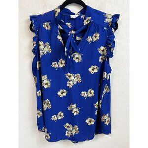 Trendy JS Sz XL Blue Floral Ruffle Sleeveless Blouse with Tie Front Detail