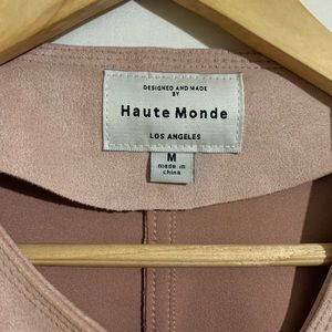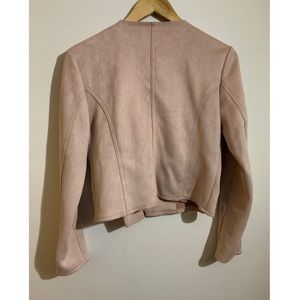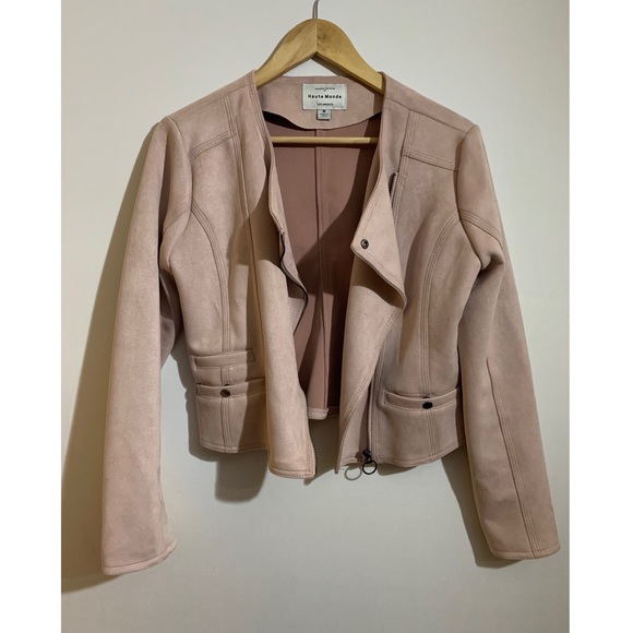 This Haute Monde jacket has a zipper closure (zipper works perfectly!). Made out of a very soft, suede like material. In a very trendy natural/nude pink color. This jacket is in excellent condition with no signs of wear at all! It is a size medium. See photos for best depiction of condition.