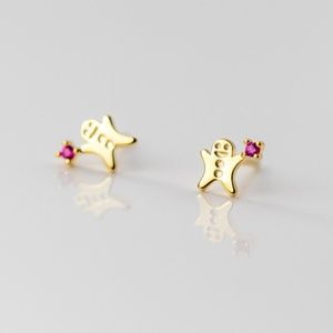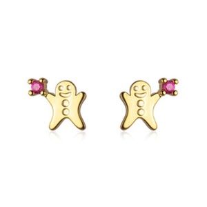 Charming gingerbread/ghost/little people-shaped earrings. Gold finish with ruby gemstone accents. Perfect for a playful look.