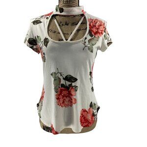 Trendy Land Women's Floral Scoop Neck Top Pink white Neck Cutouts Size Medium