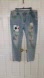 Fashionable light blue jeans with a distinctive playing card patch. Features stylish distressed details.