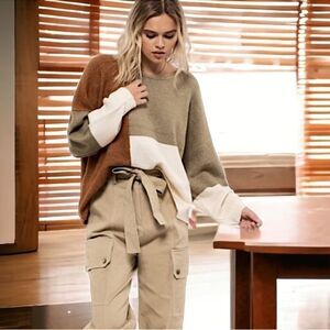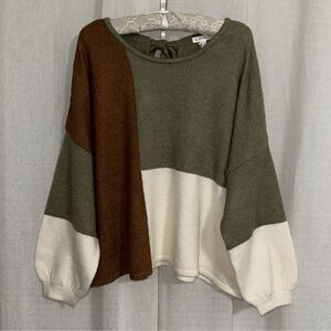 Trendy M-L Green Brown Ivory Color Block Knit Back Tie Sweater