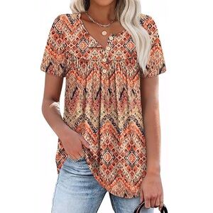 Elevate your style with this trendy orange patterned top. Perfect for casual outings or a day at the office. Comfortable and chic, this top is a must-have addition to your wardrobe.