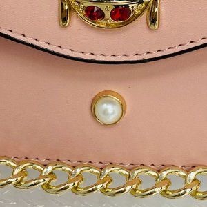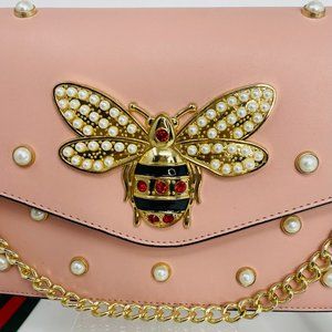 This Trendy Bee Shoulder Bag comes in faux leather, this model brings together a green and red wide striped shoulder strap. Enriched with all-over faux pearl effect studs, this shoulder bag features an envelope style front flap closure, a gold-tone chain strap and a large bee motif embellished with rhinestones and faux pearls.
