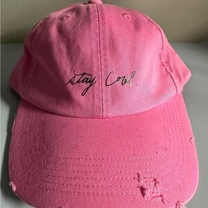 A very cool handwritten and vibrant pink cap with stylish 'Stay Cool' text. Perfect for everyday wear.