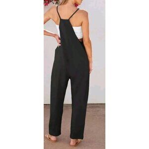 A versatile black jumpsuit with spaghetti straps offers a casual yet stylish look. Its large pockets add practicality, perfect for daily wear.
