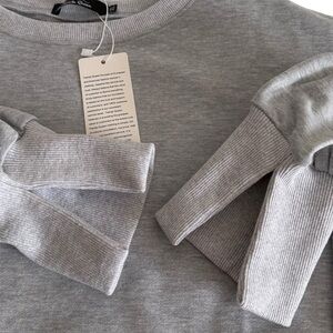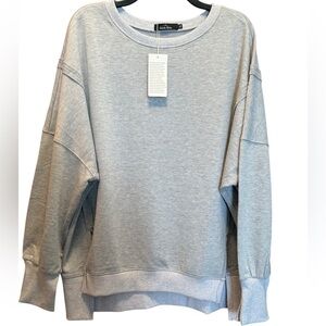 Trendy Queen Oversized Sweatshirt. New with Tags. A step above the classic sweatshirt. Long sleeves with slit in cuffs. The exposed seams in front and back add interest. Bottom hem matches sleeve cuff with symmetrical slits at sides. Crew neck. Slightly longer in back. Perfect for fall or winter. Color: Light Gray, Size XL. 56% polyester 44% Cotton. Pet free smoke free environment.