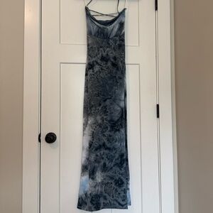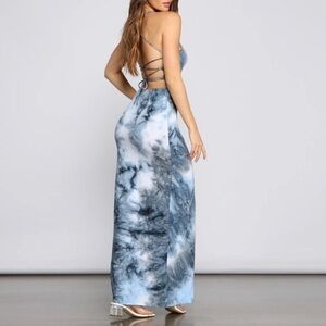 This adorable maxi dress brings those trendy summer vibes! It features a sleeveless square neckline, spaghetti straps that lead to a cross-back lace-up design, a high waist seam, and a floor-length fitted silhouette with a thigh-high front slit. The brushed knit fabric has a cool all-over tie-dye print. Style this dress with strappy sandals.