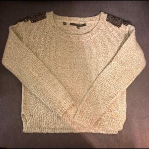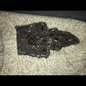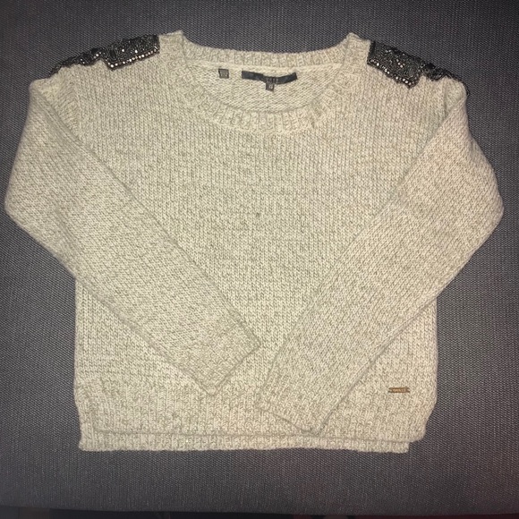 Shorter/crop like sweater with beautiful design on shoulder pads (somewhat heavy), pretty wide neck