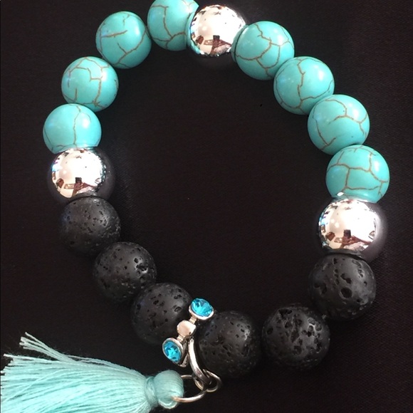 Trendy Tassel with rhinestone accent Black Lava Stone and Turquoise Howlite Diffuser Bracelet. Stretch bracelet measures 7β.