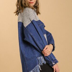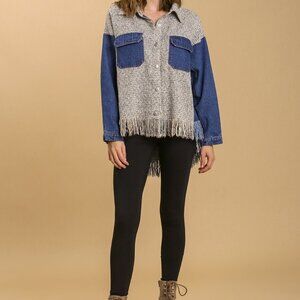 Designer Tweed Detail Button Front Denim Jacket & Frayed High Low Scoop Hem