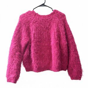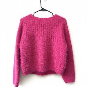 This hot pink sweater is loose fitting, cropped, and great for the fall weather.