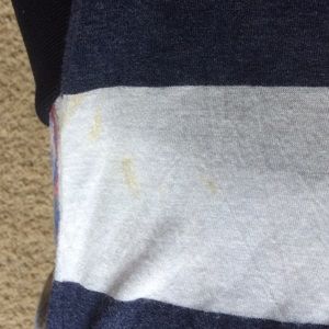 The shirt has navy blue and white stripes throughout the shirt with white polka dots on the shoulder and neck area. Only worn once. It has a small stain, but it's not very noticeable. Offers are accepted!