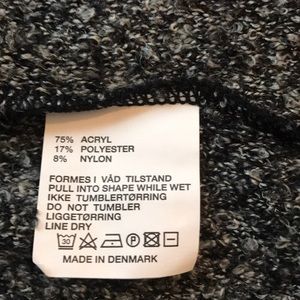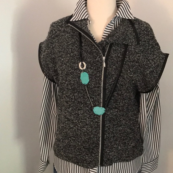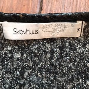 Versatile knitwear sweater by Danish designer Skovhuus. Zip front. Faux leather trim on neckline and sleeves. Also a strip running down the back. Dress it up or down. Size M. Excellent condition.