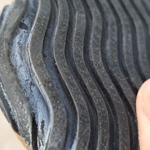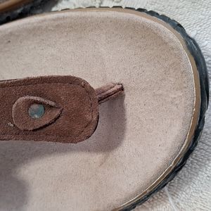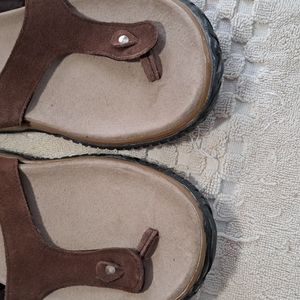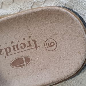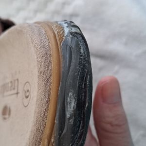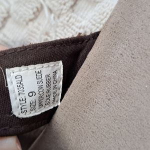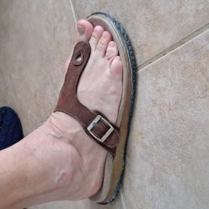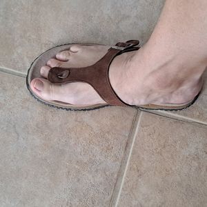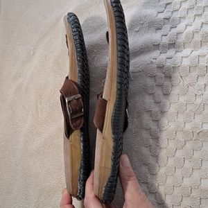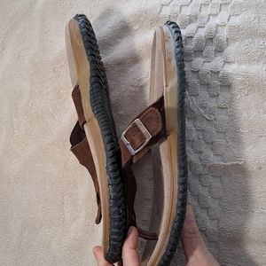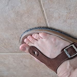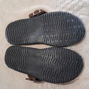 Size 9 Leather.ALL questions.Rubber has a whitish hue from time..not wear..Silver buckle..I wear a 10 always..just too small..not new,but look unworn