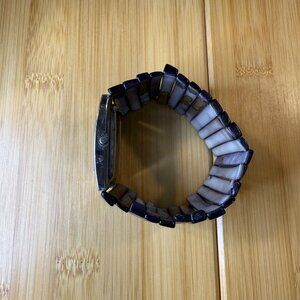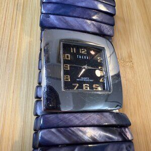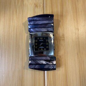 Excellent condition! Runs great with a brand new battery. Minimal cosmetic wear. This model has a wide purple gemstone stretch bracelet and a silver tone square metal case. The dial is black with gold tone accents. Water resistant. Box not included