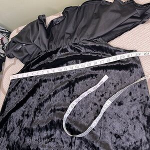 Chic black velvet dress with an off-shoulder design. Perfect for evening events.