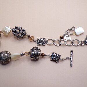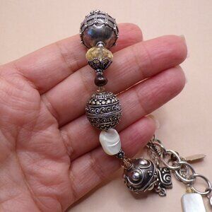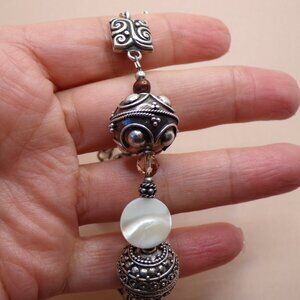 Vintage Tres Jolie Balinese bracelet, all sterling silver, this bracelet has big and very ornate beads (around 15mm beads) with shell and a faceted citrine bead, will fit larger a wrist around 8 inches with an extension chain for bigger sizing, toggle clasp, great condition, lots of silver!. Fast shipping.