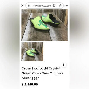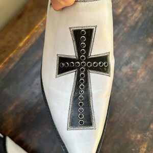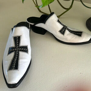 Tres Outlaws white with black Cross Swarovski crystals Pointed Toe mules sz 8.5v