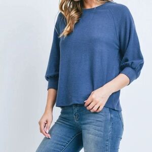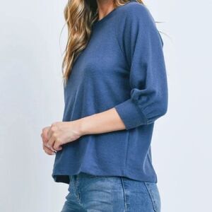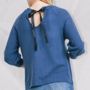 Tresics Blouse Round Neck Mid Length Sleeve Tie Back Ribbed Cuff Blue W S/M NWOT