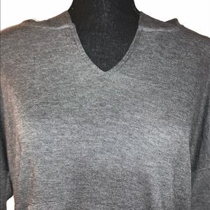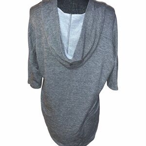 Gray half sleeve hooded top. High-low. Kangaroo pockets. 65% rayon/33% polyester/2% spandex. Size: small. Preowned in good condition.