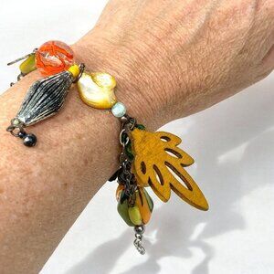 Treska beaded bracelet with funky chunky dangling beads in a botanical theme of orange, green yellow and gold. This is slightly stretchy and slides on and off. So many different charms, including lazer cut wood leaf, marbled art glass beads, rhinestones and mother of pearl buttons. In very good preowned condition. Circumference is approximately 10 inches around. Made by Treska.