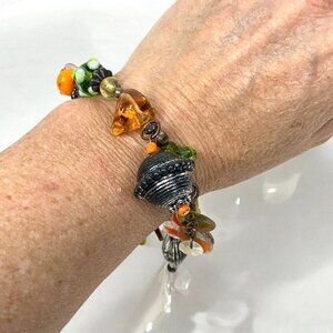 Treska Jewelry Botanical Beaded Charm Bracelet Orange Green Silver Art Glass