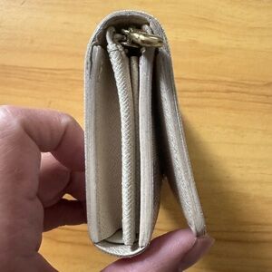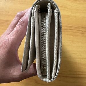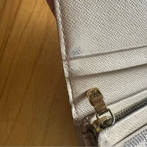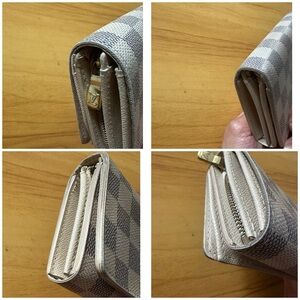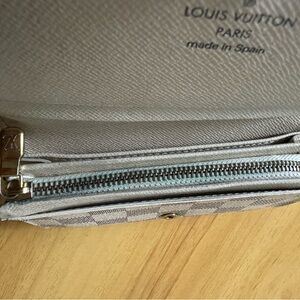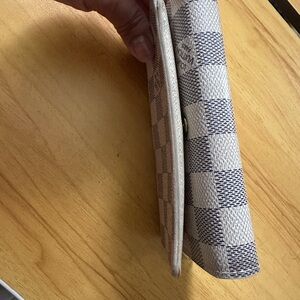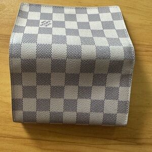Stylish Louis Vuitton wallet with a checkered pattern. Features a classic design in gray and white.