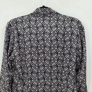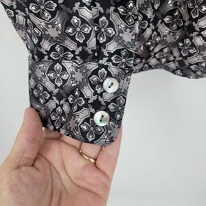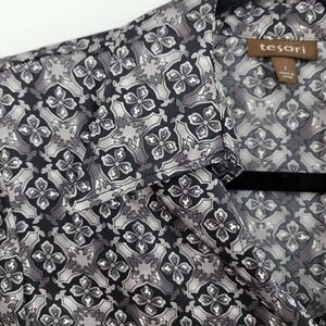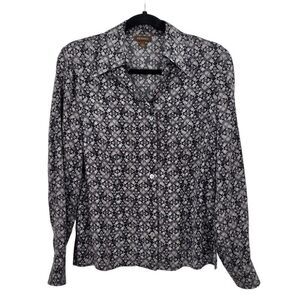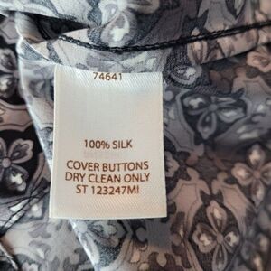This chic Tresori blouse, made from pure silk, features a long-sleeve design with a unique V spread dagger collar. The button-up style is coupled with a stunning gray retro print, perfect for adding a touch of vintage charm to your look. Sized as small.